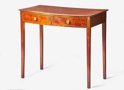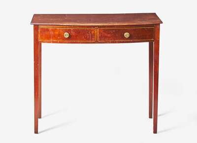 With plain top, over two drawers, on tapered square legs.