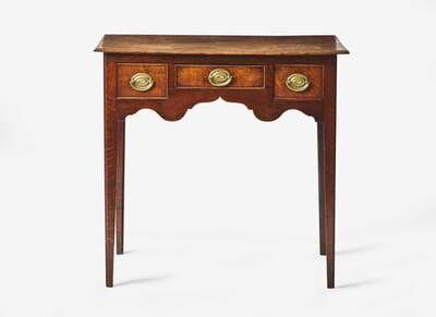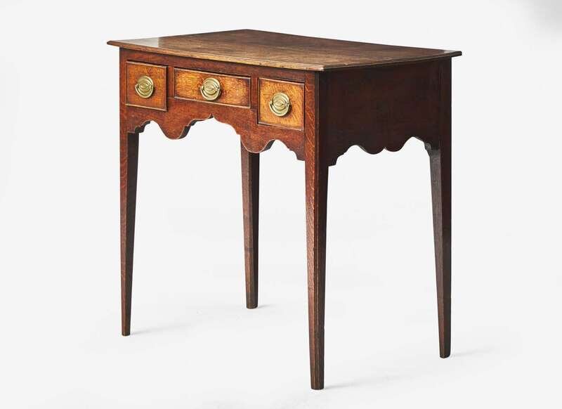 With rectangular top with molded edge, over three short drawers, shaped apron, on square tapered molded legs.