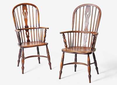 A pair of English provincial carved elm and ash Windsor armchairs, 19th century