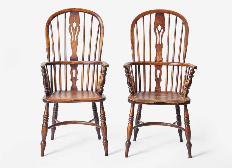 With hoop backs having pierced splat flanked by spindles, armrests over shaped seat, on turned legs connected be stretchers.