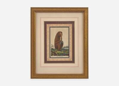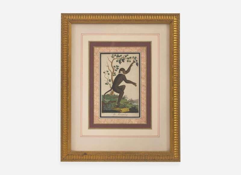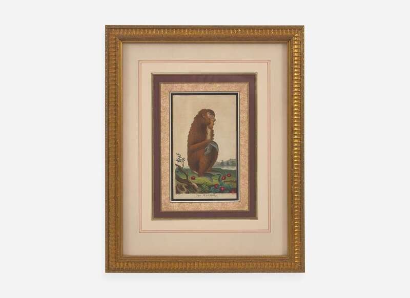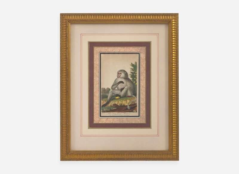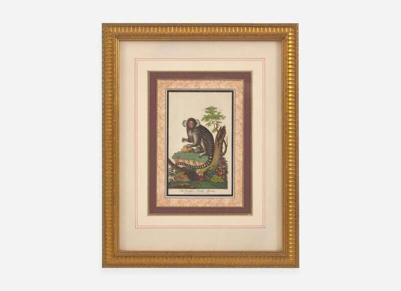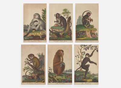 Copperplate engravings, taken from Ebenezer Sibly's An Universal System of Natural History, Including the Natural History of Man (originally published 1794), each depicting the following: “The Tamarin or Great-eared Monkey,” engraved by John Pass after a drawing by George Edwards; published June 1st, 1796; “The Ouistiti or Striated Monkey,” engraved by John Pass after a drawing by George Edward, published August 1st, 1796; “The Mangabey,” engraved by John Pass after a drawing by Johann Jakob Ihle, published December 1st, 1795; “The Marikina or Silky Monkey,” engraved by John Pass after a drawing by Johann Jakob Ihle, published June 1st, 1796, “The Mandrill,” engraved by John Pass after a drawing by Johann Jakob Ihle, published July 15th, 1795; and “The Dog-faced Baboon,” engraved by John Pass after a drawing by Johann Jakob Ihle, published October 15th, 1795; all professionally matted and framed.