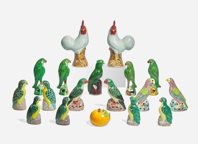 Comprising a pair of roosters, with impressed Chinese marks to underside; five pairs of green and/or yellow parrots, three single green parrots, and a pair of purple, turquoise, and green parrots, many with old labels or stickers to underside; and a modern ceramic persimmon, with contemporary label to underside, “Made in China.” (18 items total).