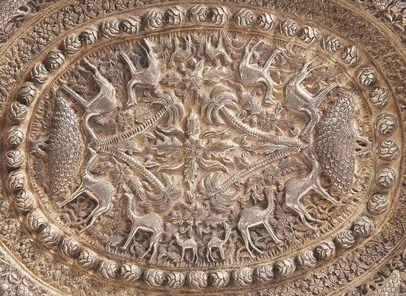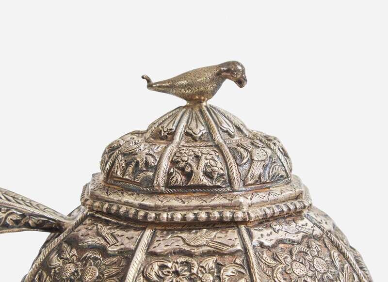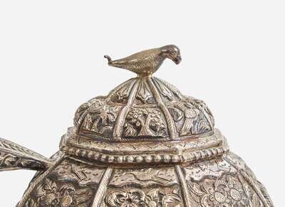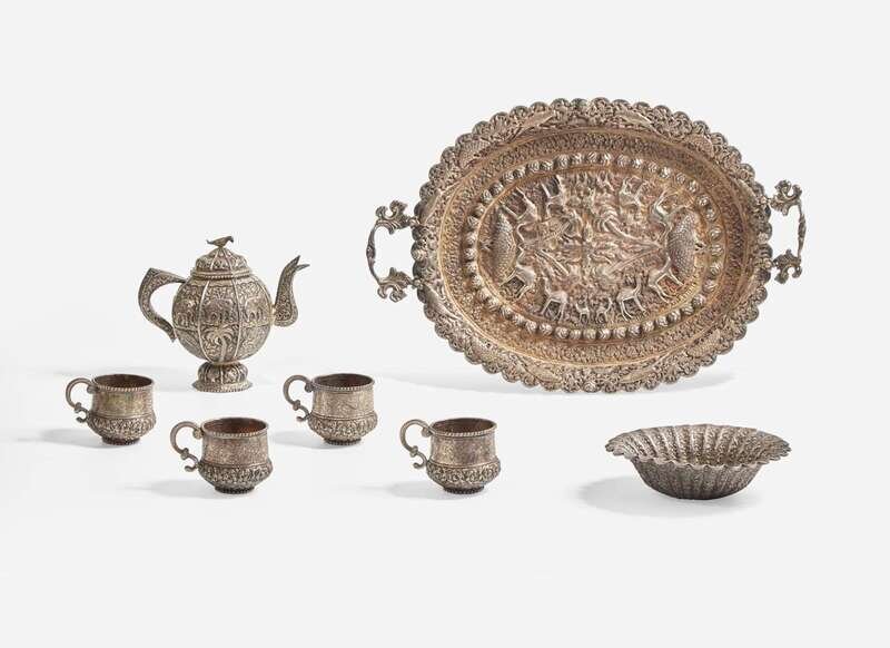 Comprising a two-handled oval scalloped tray, a teapot, four teacups, and a scalloped bowl, the bowl possibly assembled; each item allover decorated with elaborate repoussé foliate motifs, the tray depicting trees, palm trees, camels, parrots, and the teapot depicting trees, palm trees, elephants, and birds, with bird-form finial to lid; no visible marks.
