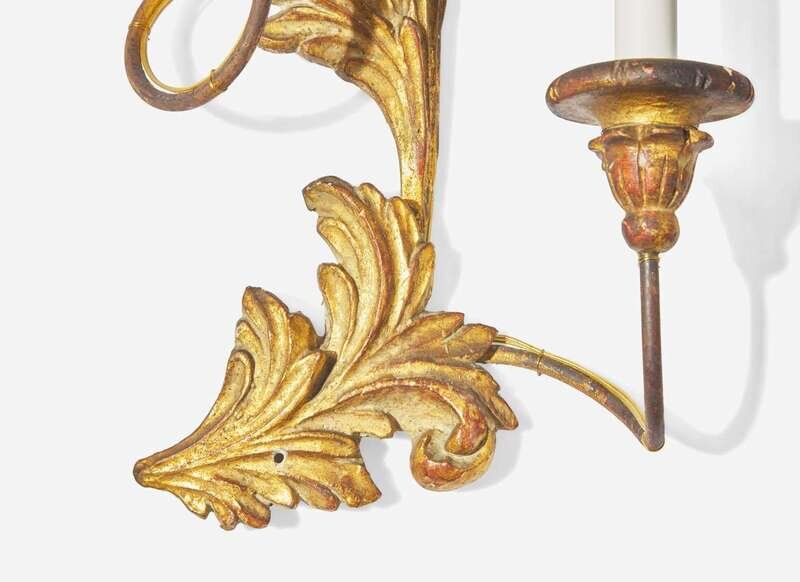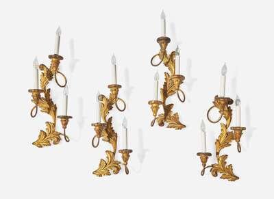 A set of four Rococo style giltwood and metal three-light sconces, 20th century