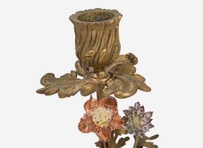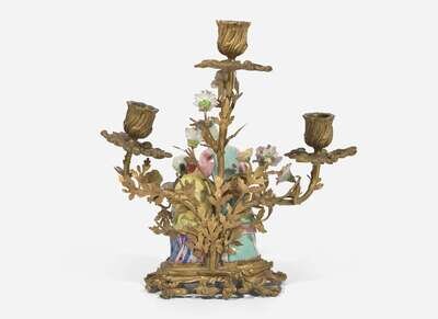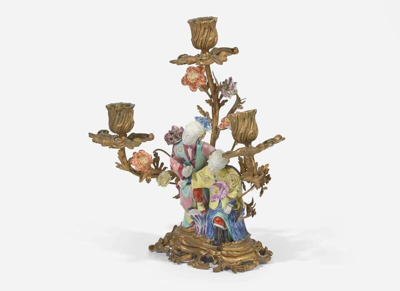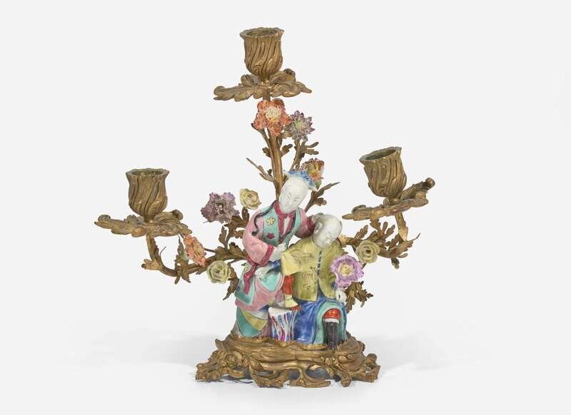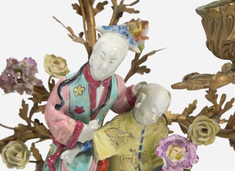 A gilt-bronze mounted Chinese figural porcelain three-light candelabra, the figure 18th century, the gilt bronze 19th century