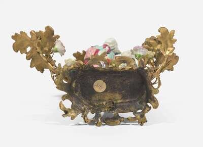 Depicting two figures among floral sprays, with applied porcelain flowers.
