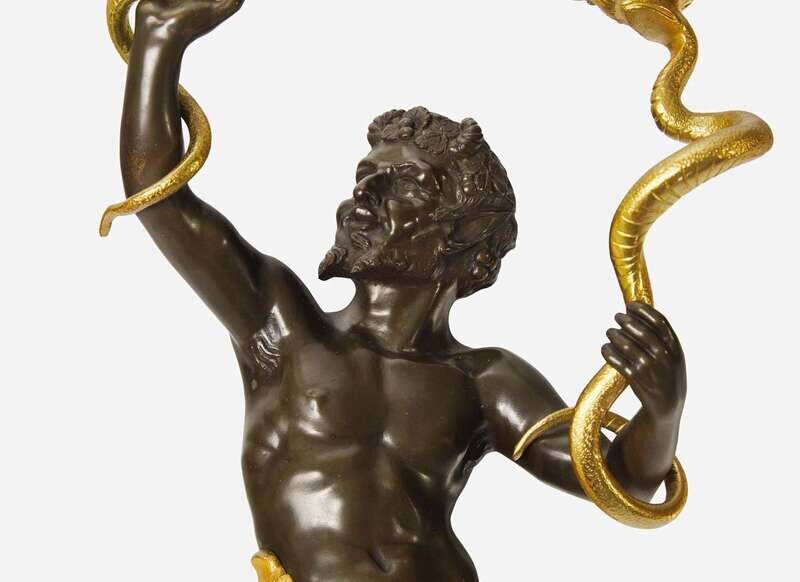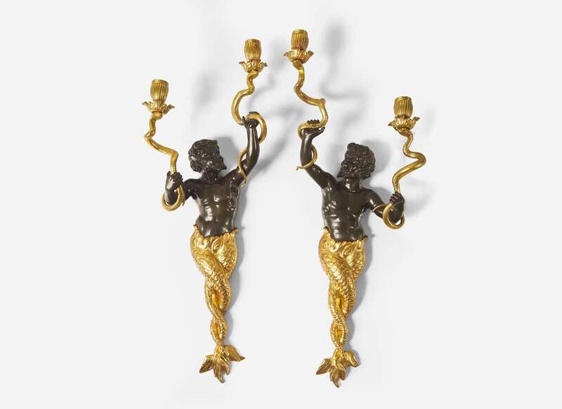 A large pair of Louis XVI style gilt and patinated bronze wall sconces depicting mermen, late 19th century