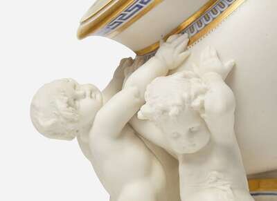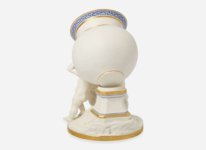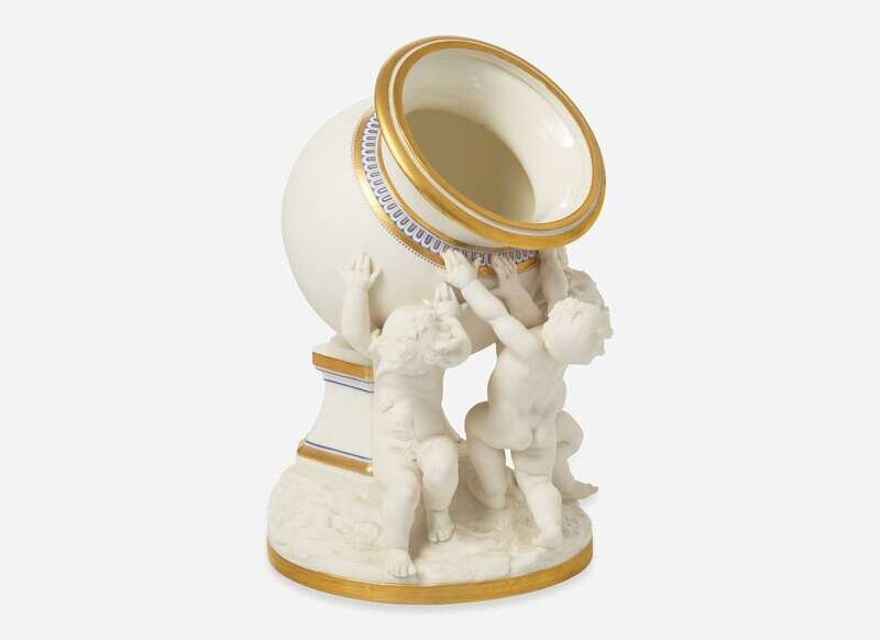 In the form of three putti erecting a globular urn onto a plinth