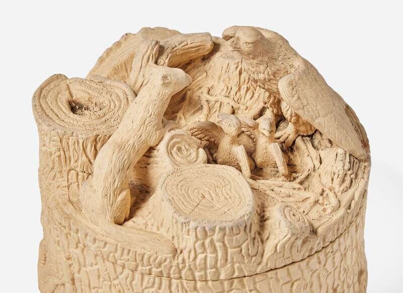 In the form of a tree stump on which a stoat is attacking an eagle's nest; underplate with impressed basketweave design