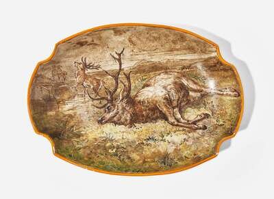 A Wedgwood Enamel Decorated Queensware Dish with Dying Stag, UK, late 19th century