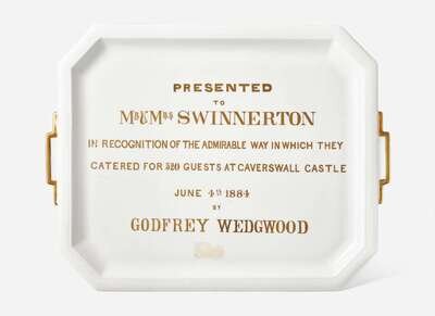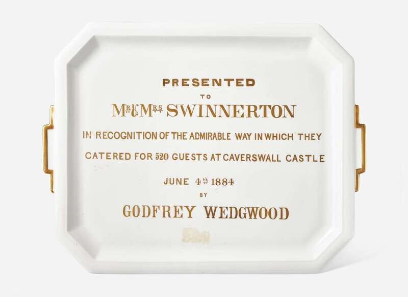 The text in gold reading, “Presented to Mr & Mrs Swinnerton in recognition of the admirable way in which they catered for 520 guests at Caverswall Castle June 4th 1884 by Godfrey Wedgwood”