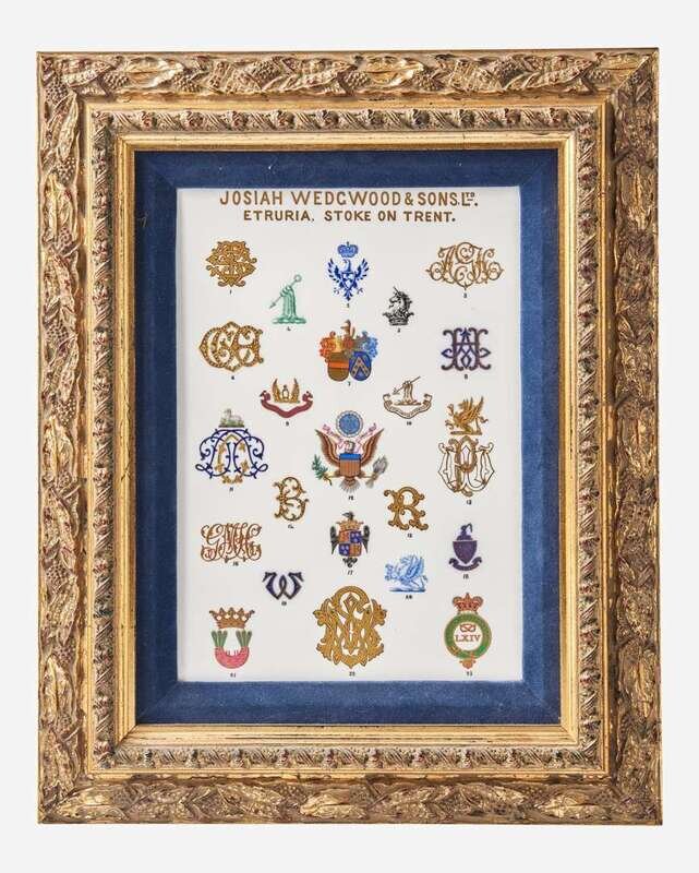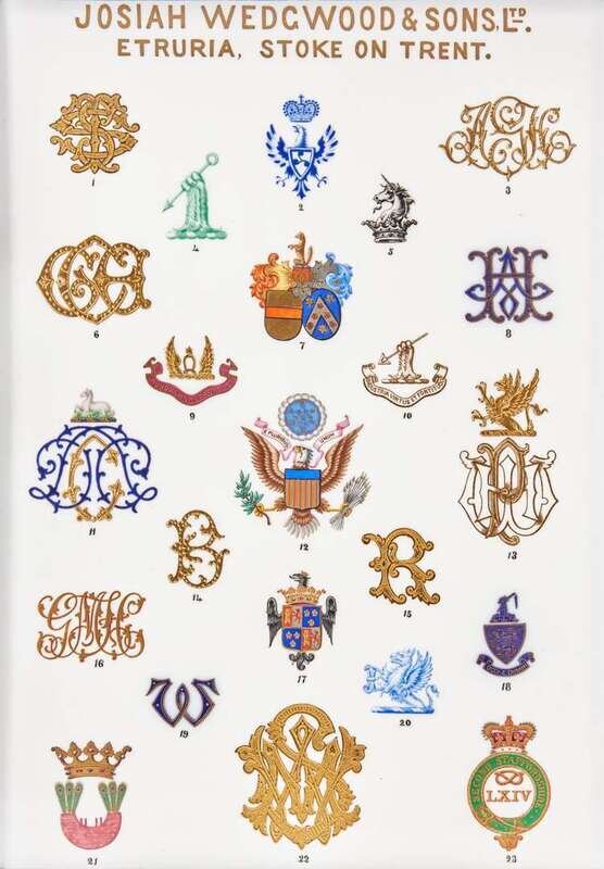 Decorated with a series of “badges” or topmarks and monograms for dinnerware decoration, including the Great Seal of the United States, as it appeared on the Theodore Roosevelt State Service, produced by Wedgwood in 1902