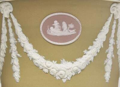In green dip jasper with applied white decoration and lilac medallions; Borghese shape