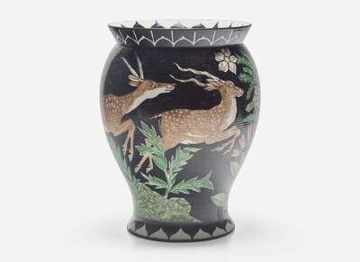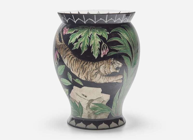 Decorated with a tiger chasing antelopes against a black ground