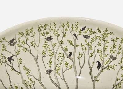 The interior decorated with a tree full of black birds, the exterior decorated with a landscape with a Tudor country house