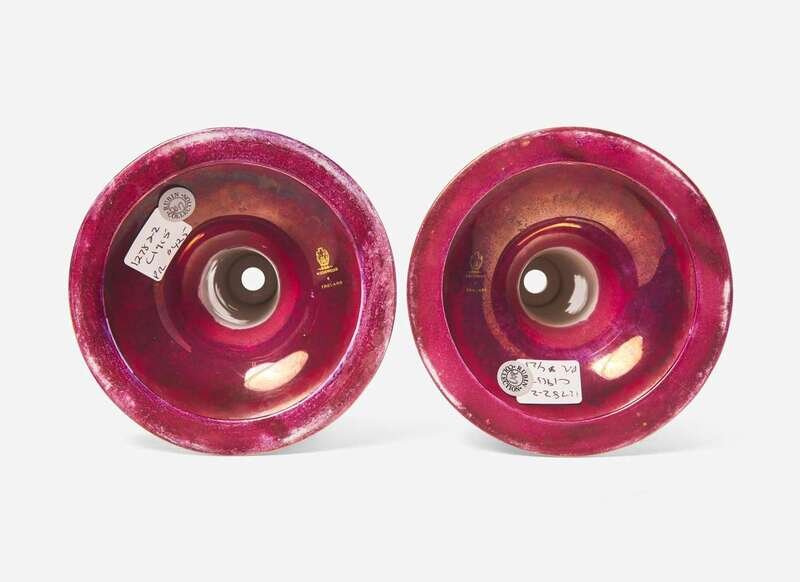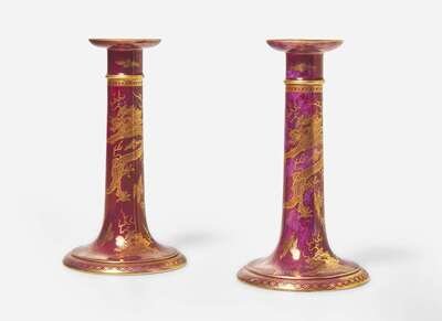 A Pair of Wedgwood Ruby Dragon Lustre Candlesticks, UK, circa 1915