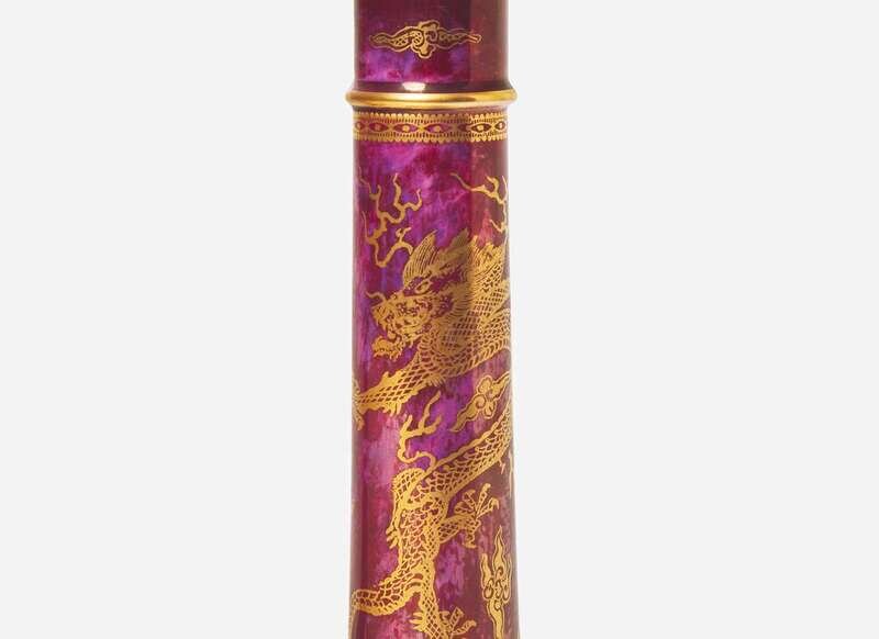 Decoration designed by Daisy Makeig-Jones (1881-1945) in the “Celestial Dragons” pattern, on a ruby lustre ground; Reading shape