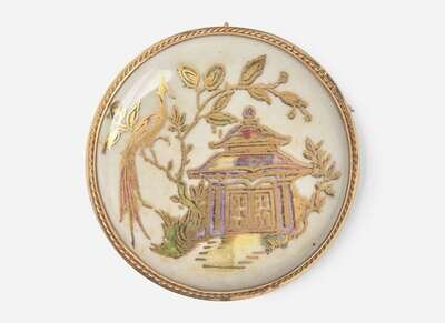 Decoration designed by Daisy Makeig-Jones (1881-1945), of a pagoda and a bird, against a mother of pearl background
