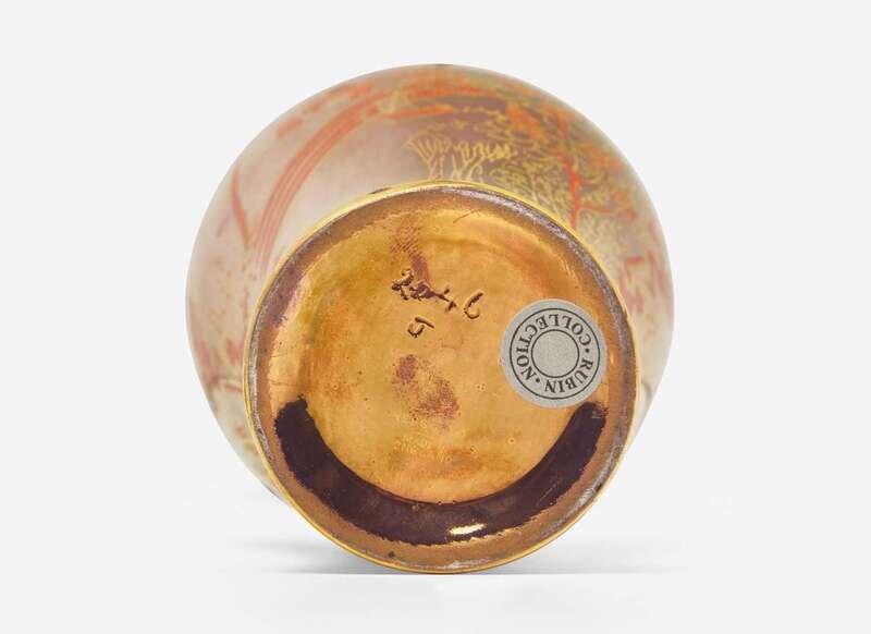 Decoration designed by Daisy Makeig-Jones (1881-1945) in the “Rainbow” or “Bifrost" pattern, in the Coral and Bronze colorway; Shape 2046