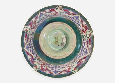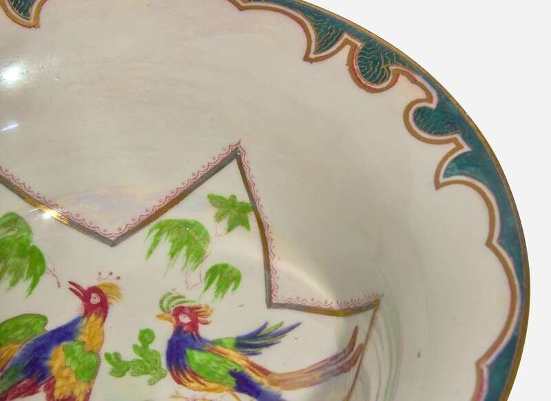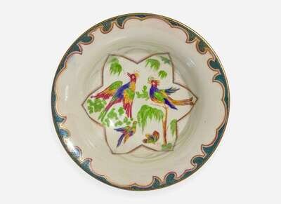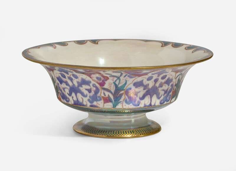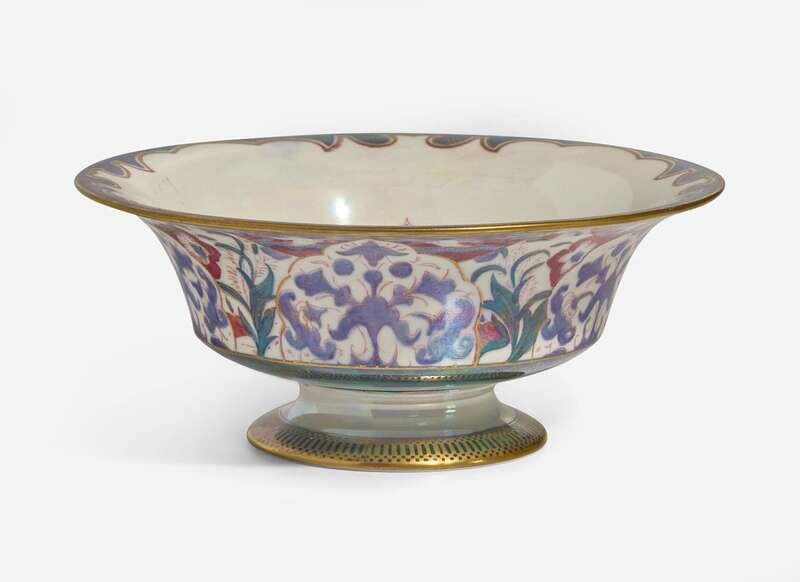 Decoration designed by Daisy Makeig-Jones (1881-1945), in the “Nizami” pattern (exterior); unknown interior decoration of pheasants on a mother of pearl lustre ground contained in a six-pointed star; Daventry shape, #3427