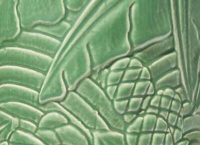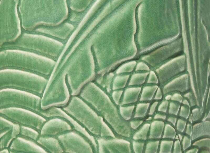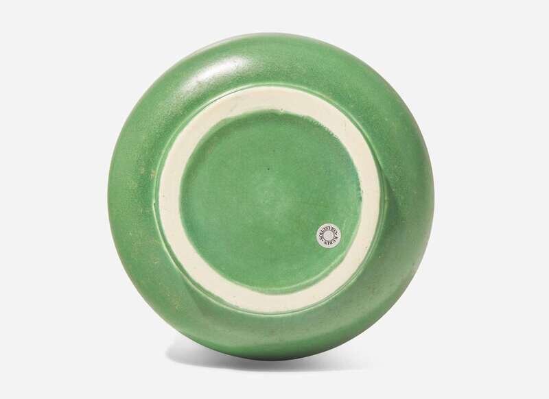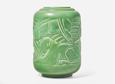 Designed by Erling (“Eric”) B Olsen (1903-1992), with relief of a lioness against a stylized background; glazed in Matt Green