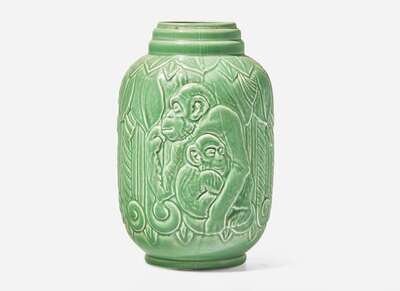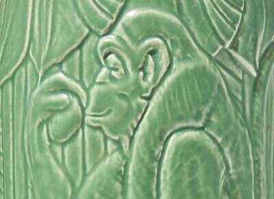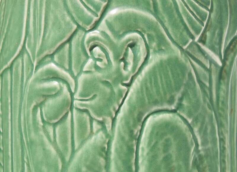 Designed by Erling (“Eric”) B Olsen (1903-1992), with molded relief of chimpanzees against a stylized foliage background, glazed in Matt Green