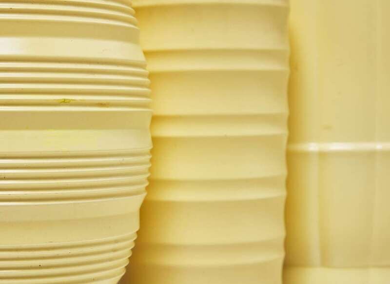 Comprising three vases in matt straw glaze: tall fluted, a cylindrical, and ovoid examples