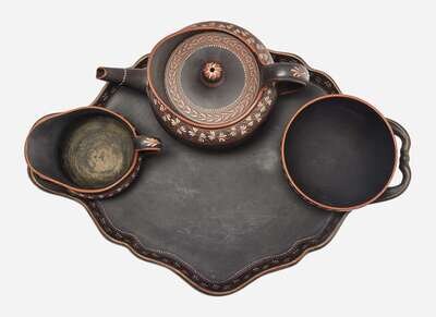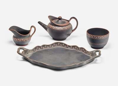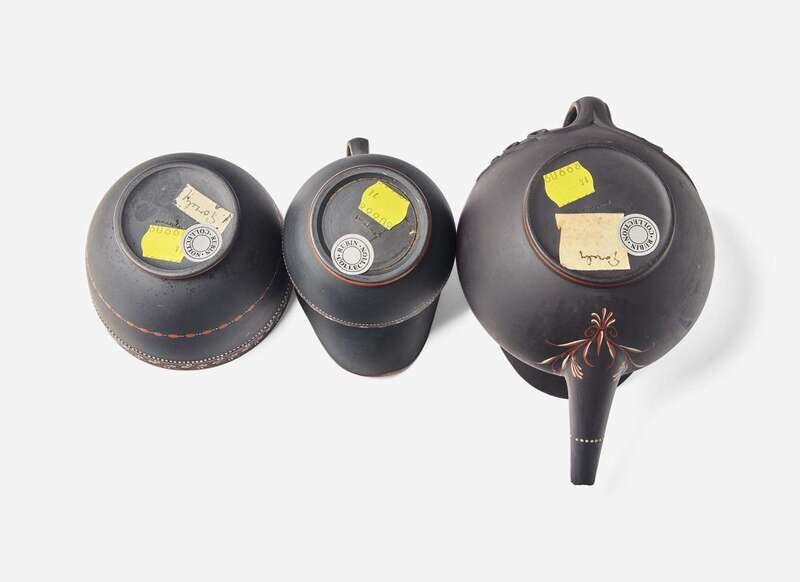 An Assembled Wedgwood Encaustic Decorated Black Basalt Tea Set, UK, circa 1790-1800