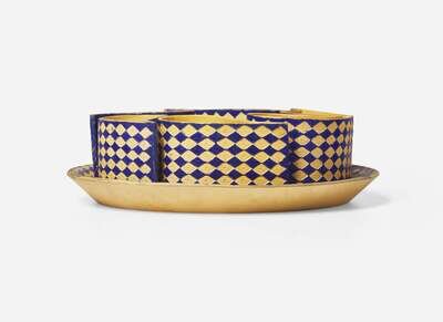 Dia: 7 ½ in. (the tray); H: 1 1/8, W: 3 1/8, D: 1 ¾ in. (the cups, each)