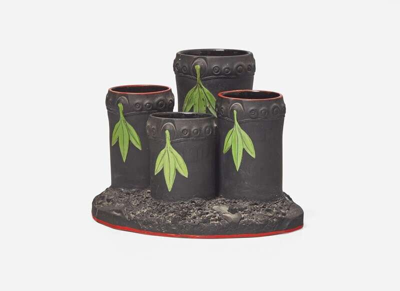 A Wedgwood Encaustic Decorated Black Basalt Four Tube Bamboo Form Vase, UK, circa 1800