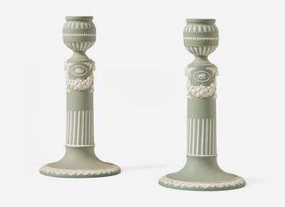 A Pair of Wedgwood Green Dip Jasperware Candlesticks, UK, late 19th century