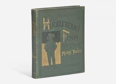 New York: Charles L. Webster and Company, 1885. First American edition, first printing (meeting all points per BAL, except those on pp. 161 and 283, as usual). 8vo. 366 pp. Illustrated by E.W. Kemble, and with a photogravure portrait frontispiece (BAL state 1). Publisher's pictorial green cloth, stamped in black and in gilt, slight wear at edges and top and tail of spine, boards lightly rubbed, minor staining on rear board; fake Twain autograph mounted below half-title; scattered spotting to text; chipping along fore-edge, pp. 217-220; rear hinge likely reinforced; in modern quarter dark green morocco slip case and chemise. BAL 3415; Grolier, American 87