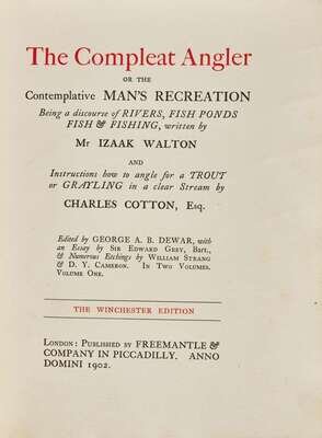 London: Published by Freemantle & Company, 1902. In two volumes. “Presentation Copy” of the Winchester Edition, signed by illustrators William Strang and D.Y. Cameron (from a total edition of 150 copies). 4to. lxvii, (i), 169, (1); ix, (i), 232 pp. Edited by George A.B. Dewar. Illustrated with etched frontispiece portraits in each volume, each printed in two states, on wove and india paper; 28 etched plates, each printed in two states on wove and india paper; 42 etched in-text and head- and tail-pieces throughout set; all by Strang and Cameron; plates with captioned tissue guards. Includes a folding facsimile of Walton's last will and testament in first volume. Publisher's full brown vellum over beveled-edged boards, stamped in gilt, boards rubbed and bowed, rear board of each volume scratched, spine ends worn; top edges gilt, other edges untrimmed; tape residue on front free endpaper and rear paste-down of first volume; small morocco book-plate of Alfred Howard Thompson on front paste-down of each volume. Coigney 215