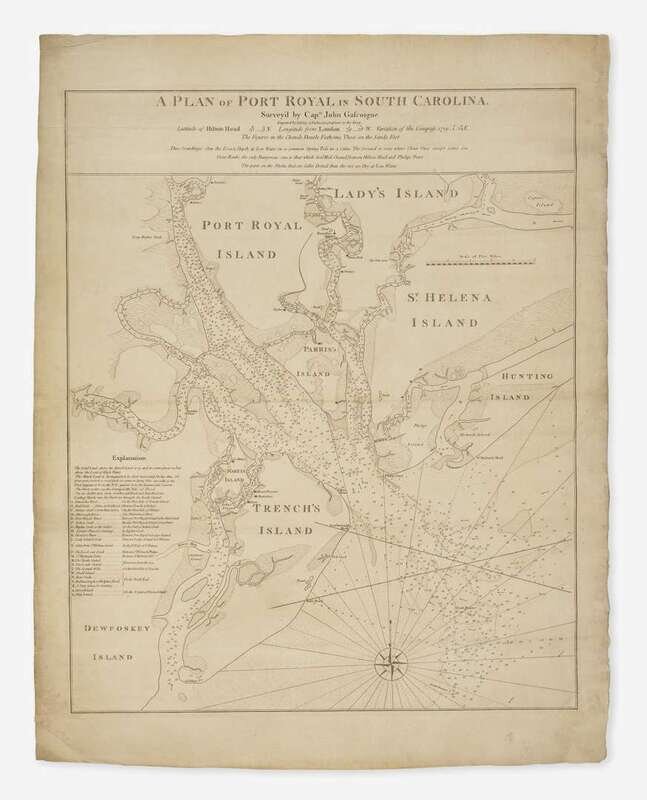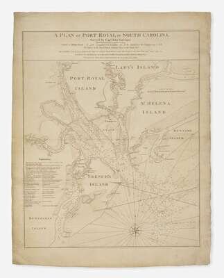 A very rare and highly detailed sea chart, the most important map of South Carolina's Port Royal Sound and Hilton Head made in the early days of the Revolutionary War. This very finely engraved and immensely detailed chart was superior to all other maps printed of the region, and the most important portrayal of the Port Royal Sound available in the early days of the Revolutionary War.