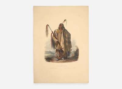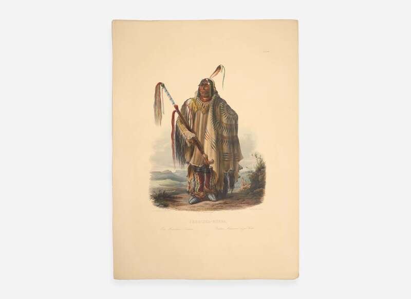 A fine example of one of Bodmer's most desirable portraits, depicting Hidatsa Chief Pehriska-Ruhpa ("Two Ravens"), considered one of his masterpieces. From Bodmer's Travels in the Interior of North America.