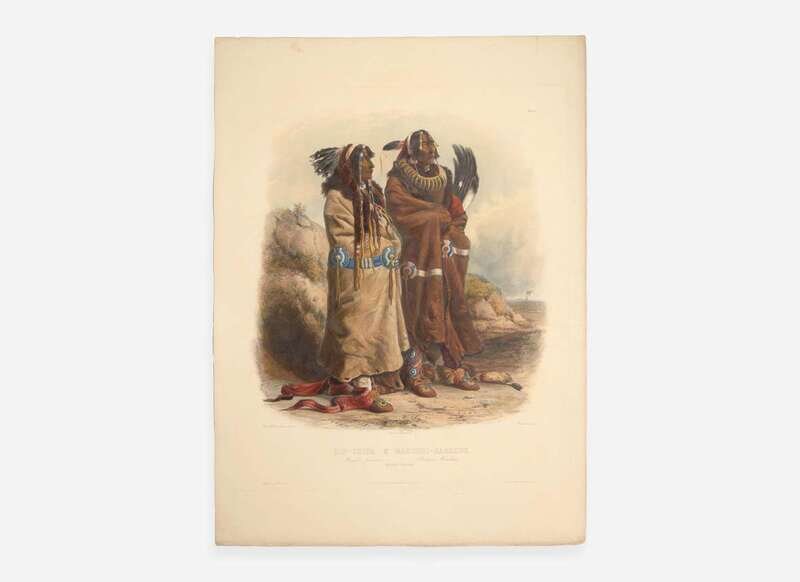 Coblenz: J. Holscher/London: Published by Ackermann & Co./Paris: Arthus Bertrand, (1839-42). Tab. 20. Hand-colored aquatint engraving by Hurlimann after Bodmer; “C. Bodmer” blindstamp below imprint. Small stain in top left edge; light wear and darkening along left and bottom edges. 24 3/4 x 18 1/4 in. (628 x 463 mm). Graff 4648; Howes M-443a; Pilling 2521; Sabin 47014; Wagner-Camp 76:1