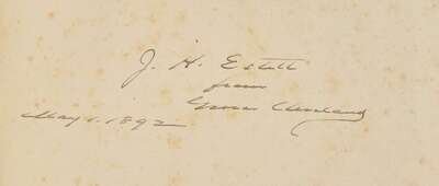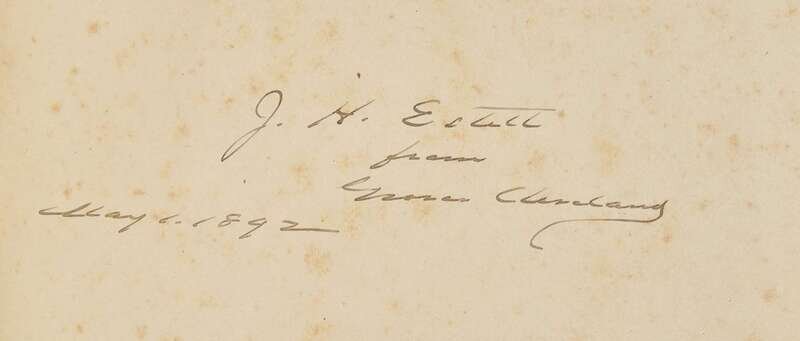 A fine presentation copy of Grover Cleveland's public papers, inscribed by him between his first and second terms to newspaperman John Holbrook Estill (1840-1907). Estill, a prominent citizen of Savannah, Georgia, was the Georgia representative of the Democratic National Committee in 1892 when Cleveland inscribed this volume. From 1867, until his death in 1907, he was the proprietor of the Savannah Morning News. He also served as Chatham County Commissioner, from 1882-1894, and unsuccessfully ran for governor of Georgia in 1902. Following the Civil War he served in a number of corporate positions that contributed to the growth of Savannah, including as president of the City and Suburban Railway, vice-president of the Georgia Telephone and Telegraph Company, director of Citizens Bank, and other roles in the Savannah Investment Company, the Metropolitan Steam Fire Engine Company, the Chatham Real Estate and Improvement Company, the Mutual Gas Light Company, the Atlantic Coast Line Railroad Company, and the Savannah Racing Association.