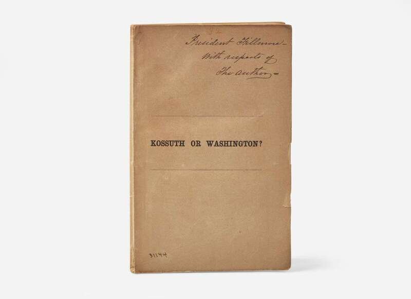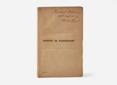 Presentation copy, inscribed by the author on the front wrapper to 13th President Millard Fillmore. This address given by Henry Augustus Boardman, pastor of the Tenth Presbyterian Church in Philadelphia and prolific author, denounces the policy of political intervention proposed by deposed Hungarian leader Lajos Kossuth in his speech before Congress. Kossuth, who was briefly President-Regent of Hungary, fled the country in 1851 after the collapse of his power-base. Considered a revolutionary, he was feted across England and America and addressed the Congress, exhorting them to intervene in the quarrels of foreign countries to support democracy and freedom. Boardman was highly critical of this idea. By the time Fillmore received this pamphlet, he probably shared Boardman's views. Kossuth, who was a flamboyant figure, was invited to the White House at the time of his address to Congress, and used the opportunity to call for American intervention. Fillmore mildly rebuked him, making it clear that intervention in the affairs of Europe was not American policy. Kossuth was so angry at this that he behaved very badly for the rest of the evening.