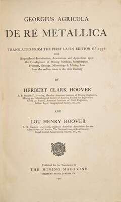 Presentation copy of the first edition in English of Agricola's authoritative work on mining and metallurgy, inscribed by future president Herbert Hoover. What set out to be a simple translation into English by the Hoovers--the first in the 356 years since the book was first published--turned out to be a much more difficult task, as many of the mining techniques described by Agricola used invented Latin terms not found in traditional Latin vocabulary. Without a guide to Agricola's references, the Hoovers had to steep themselves in the long history of metallurgical and mining texts that may have informed Agricola. As a result, the product of their effort is prized for its clarity, accuracy, and inclusion of copious footnotes and appendices.