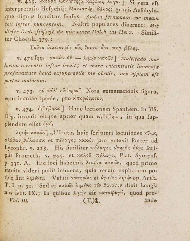 *François Jean Gabriel de La Porte du Theil's Aeschyli Tragoediarum Reliquiae…/Théatre d’Æschyl, in French and in Greek (in two volumes; Paris, 1794-95); Robert Potter's English translation, The Tragedies of Æschylus (one volume, Oxford, 1812); and the first three volumes of Christian Gottfried Schütz's Greek and Latin translation, Aeschyli Tragoediae Quae Supersunt ac Deperditarum Fragmenta (Halle an der Saale, 1808–09).