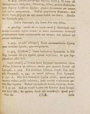 **Vol. I: Signature I in Aeschyli Tragoediae Quae Supersunt ac Deperditarum Fragmenta (p. 129, at rear); Vol. II: Sig. T in Aeschyli Tragoediae Quae Supersunt ac Deperditarum Fragmenta (p. 289, at rear); Vol. III: Lower title crossed out, Sig. T in The Tragedies of Æschylus (p. 137, at center), Sig. T in Aeschyli Tragoediae Quae Supersunt ac Deperditarum Fragmenta (p. 289, at rear); Vol. IV: Lower title crossed out; Sig. 2I in Aeschyli Tragoediarum Reliquiae (p. 65, at center), Sig. T in Aeschyli Tragoediae Quae Supersunt ac Deperditarum Fragmenta (p. 289, at rear); Vol. V: Lower title crossed out, Sig. I in Aeschyli Tragoediae Quae Supersunt ac Deperditarum Fragmenta (p. 129); Vol. VI: Lower title crossed out, with Vol. number corrected, “T.I.” at p. (271) at front; Vol. VII: Sig. T in The Tragedies of Æschylus (p. 321, at front), Sig. I in Aeschyli Tragoediae Quae Supersunt ac Deperditarum Fragmenta (p. 129, at rear)