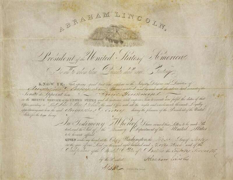 Washington (D.C.), July 1, 1863. Partially-printed commission on vellum, signed by Abraham Lincoln as President of the United States, appointing Augustus G. Carey a Third Lieutenant in the Revenue Service of the United States; counter-signed by Secretary of the Treasury, Salmon P. Chase. Creasing from old folds; vellum discolored along top edge and center fold.