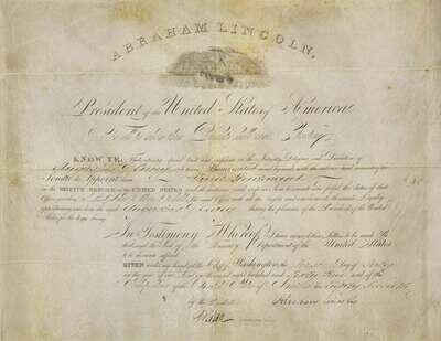 A handsome commission signed by President Abraham Lincoln, appointing Augustus G. Carey a Third Lieutenant in the Revenue Service. Carey served with distinction in the Revenue Cutter Service during the Civil War, bearing witness to the famous clash of the Monitor and Merrimac at the Battle of Hampton Roads on March 8, 1862. He was an officer aboard the great steamship Great Eastern before his retirement in 1874.