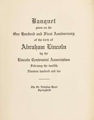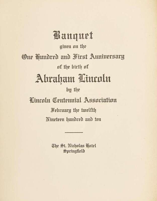 A rare program from the Lincoln Centennial Association's “Banquet given on the One hundred and First Anniversary of the birth of Abraham Lincoln”, held at the St. Nicholas Hotel in Lincoln's hometown of Springfield, Illinois, on February 12, 1910. The program prints the dinner menu, the Association's incorporators, a poem “The Heroes of Time” listing Lincoln alongside such figures as Moses and Christ, as well as the night's speakers, including Booker T. Washington, who gave the keynote address “Some Results of Abraham Lincoln's Emancipation Proclamation”. At the rear of the volume Washington has signed his name, alongside 11 other figures who were present that evening.