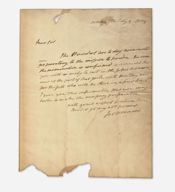 Washington, February 2, 1814. One sheet folded to make four pages, 10 x 8 in. (254 x 203 mm). One-page autograph letter, signed by James Monroe as Secretary of State, to John L. Lawrence, informing him of President James Madison's nomination of him to serve as Secretary of the Legation in Sweden: “Dear Sir The President has to day nominated you as secretary to the mission to Sweden. In case the nomination is confirmed it is expected that you will be ready to sail in the John Adams, now at the port of New York, with Mr. Clay and Mr. Russell who will be there in a few days. I give you this information that you may hasten to make the necessary preparations. With great respect & esteem I am Dear sir yr very obt servant Jas. Monroe”. Creasing from contemporary folds, two losses at top, affecting some letters in “Washington”; loss along bottom edge, but not affecting text.