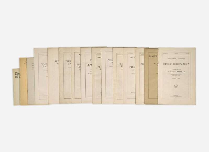 A fine collection of speeches given by Woodrow Wilson as both Governor of New Jersey, and President of the United States on a variety of subjects. All housed in a blue cloth covered slip case.