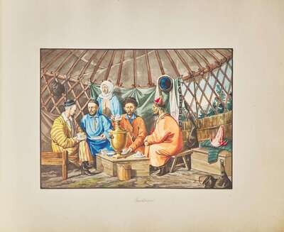 A fine mid-19th century album of original illustrations depicting the peoples of the Russian Empire. Compiled and primarily produced by Baltic German artist and sculptor J.M. Heuser, an associate of Baltic German naturalist-explorer Karl Ernst Von Baer (1792-1876). The album's 148 illustrations are diverse in style, color, finish, and detail, and show the physiognomy, dress, dwellings, and professions of the Empire's numerous peoples. The vast geographical territory of the Empire is represented, including European Russia, the Caucasus, the Volga River and the Ural Mountain regions, as well as the far east, including Siberia, the Amur River region, the Kamatchka peninsula, and more. Various groups are depicted, such as Mordvins, Tatars, Nanai, Bashkirs, Chuvash, Yukaghirs, Khanty, Tungus, Samoyeds, Korayks, Kalmyks, Cossacks, Lezgins, Armenians, Kyrgyz, Finns, and Ukrainians, as well as the peoples of northwest North America and the Aleutian archipelago. Several of the illustrations appear executed from life, while many are copies based on other sources, either printed or photographic, some being notable Russian travel surveys. Reflective of a burgeoning nationalism in Russian society and government during the reign of Tsar Alexander II, and earlier, these images follow a long tradition of Russian ethnographic illustration, from J.G. Georgi, Fedor Solntsev, Emelian Mikhailovich Karnejeff, Auguste Raffet, and more.