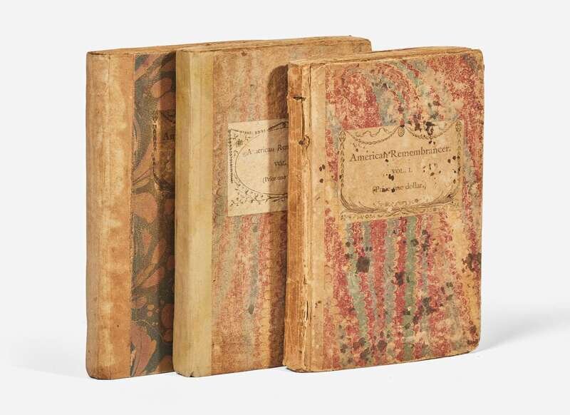 Philadelphia: Printed by Henry Tuckniss, for Mathew Carey, August 20, 1795-January 20, 1796. In three volumes. First edition. No. I-XII (all printed), each part with title-page. 8vo. 288; 288; 312 pp. Contemporary quarter paper over marbled paper-covered boards, original paper cover labels, second and third volumes rebacked to style (marbled paper on third volume possibly replaced at sometime), boards soiled and rubbed, upper fore-edge of second volume evenly shaved; top edges trimmed, other edges untrimmed; contemporary ownership signature of William Coleman at head of title-page in first volume; scattered spotting in first volume; scattered dampstaining in second volume; third volume lacking front free endpaper; title-page and pp. 3/4 in third volume starting, text leaves in same variously darkened with scattered foxing and dampstaining; in brown cloth fall-down-back box. Reese, The Federal Hundred, pp. 123-124