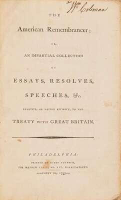 The complete run in original boards of Republican publisher Mathew Carey's nationally-distributed periodical The American Remembrancer, published in response to John Jay's proposed treaty with Great Britain. In 1794 Jay was sent by President Washington to negotiate with Great Britain on several matters left unresolved since the Treaty of Paris and which threatened to again engulf the two nations in war. Most concerning were the increasing British attacks on American merchant vessels and the impressment of American sailors into the British Navy, as well as the continued presence of British troops in the Northwest Territory, and their support of Native American raiding parties. In pursuance of a treaty, Jay made several concessions to the British that created a political firestorm at home. The ensuing political uproar helped mark the emergence of political parties in the United States, which this publication documents.