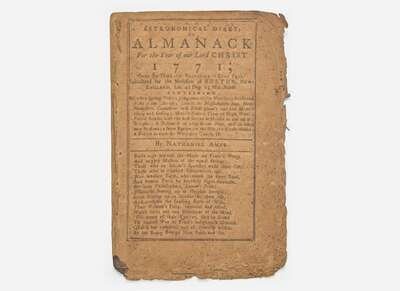 A scarce edition of Nathaniel Ames's almanac for 1771, featuring Benjamin Franklin's famous mock epitaph on p. (4), composed by him when he was just 22-years old: “The Body of Benjamin Franklin, / Printer, / Like the Covering of an old Book, / Its Contents torn out, / and stript of its Lettering and Gilding, / Lies here, Food for Worms; / But the Work shall not be lost, / It will (as he believed) appear once more, / In a new and more beautiful Edition, / Corrected and amended / By the Author. / He was born January 6th, 1706, and / died _____17___”.